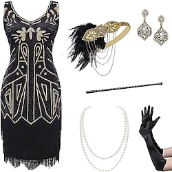Season:Spring Summer,All Seasons,Fall Winter; Sleeve Length:Sleeveless; Look After Me:Washable; Gender:Women's; What's in the box:Neckwear,Earring,Headwear,Gloves,Dress; Types:Outfits,Cosplay Costume,Flapper Headband,Flapper Dress; Holiday:Easter,Masquerade,Carnival,Christmas,Halloween; Style:Roaring 20s,1920s,Retro Vintage; Elasticity:Micro-elastic; Occasion:Halloween,Party / Evening; Material:Polyester; Age Group:Adults'; Characters:The Great Gatsby; Design:Tassel Fringe,Sequins; Listing Date:07/28/2023; Clothing Length:; Bust:; Waist: