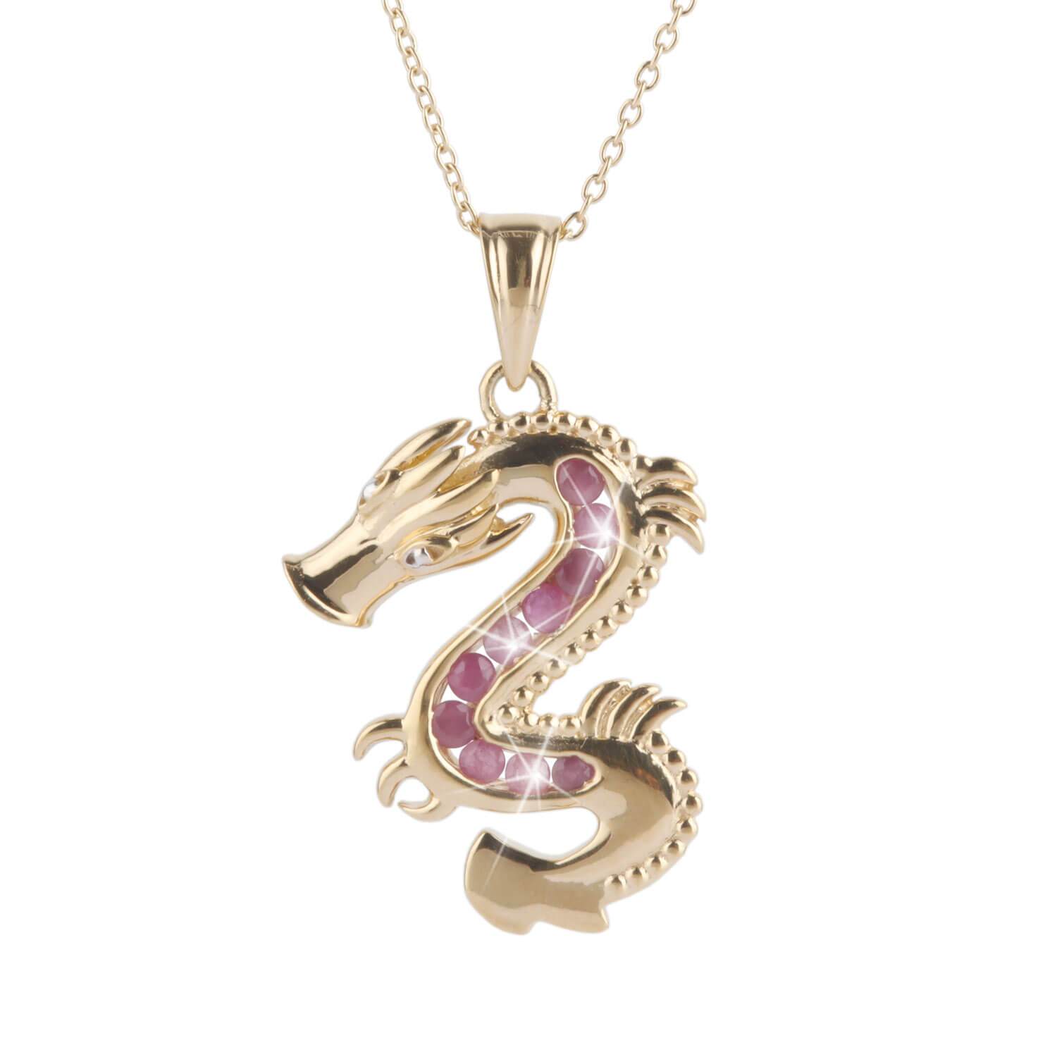 An intriguing design set to release your hidden dragon. This pendant features 10 genuine rubies that flow down the center of the winding dragon’s body adding eye catching appeal. This intricate design is crafted from sterling silver plated in rich yellow gold to add that final touch of luxury