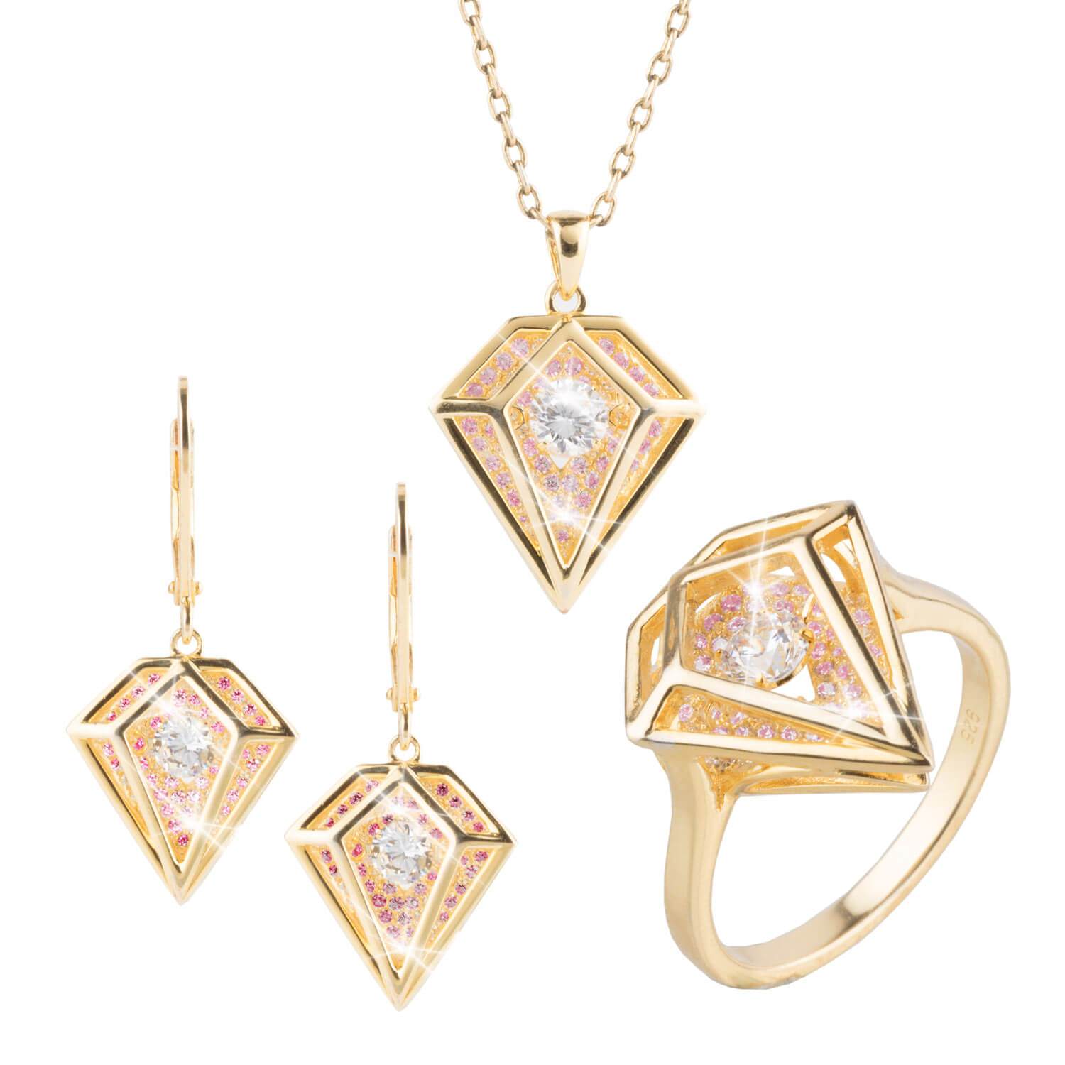 We've all heard that Diamonds are a girls best friend. This collection has everything you need. A diamond shaped collection is enhanced with shimmering pink stones, which encapsulate the backdrop to the main attraction. A beautiful, solitaire white Diamondeau®, the supreme diamond alternative, is set at precision angles allowing continuous movement of this center gem with every movement made. This is sure to make you sparkle all day.