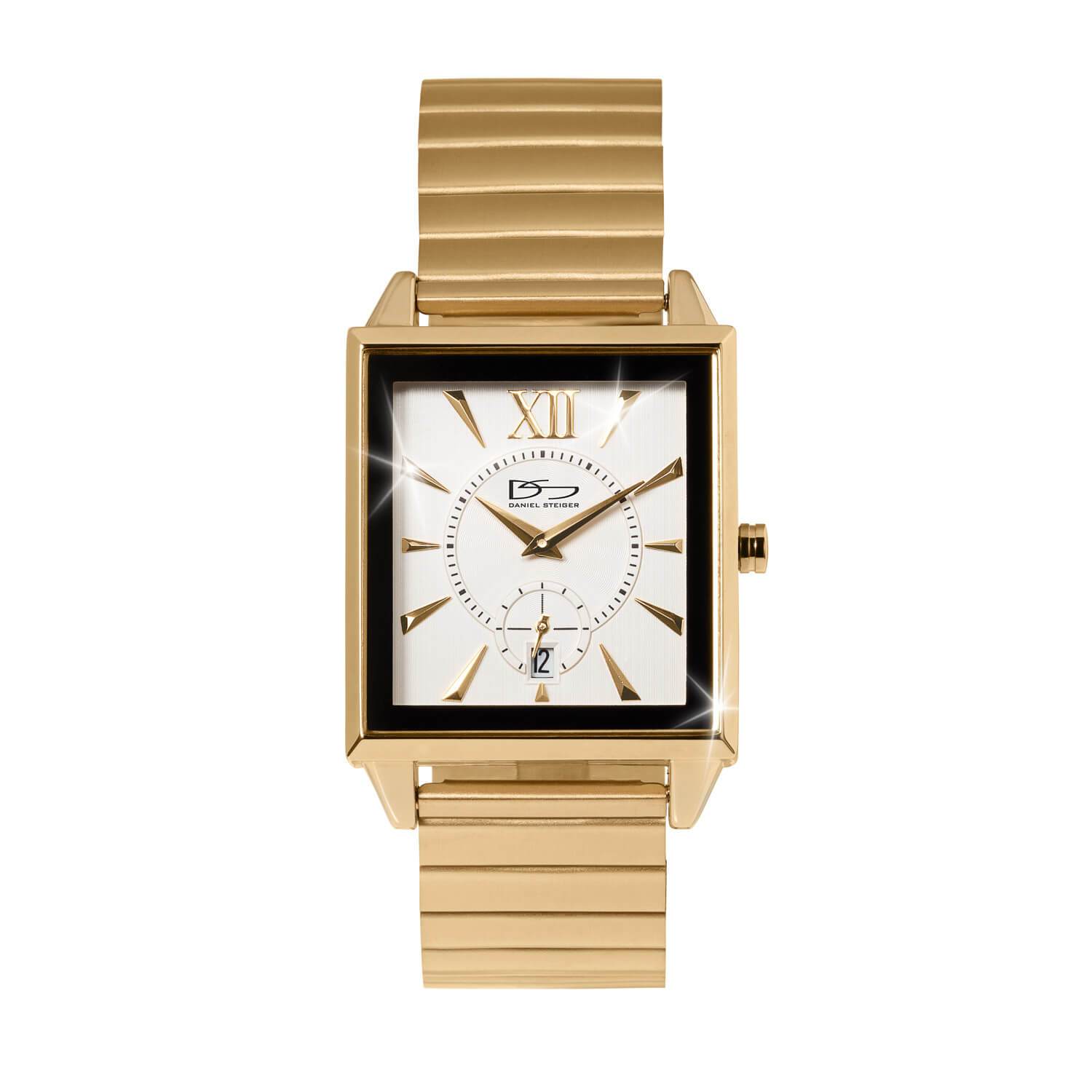 Our Quadro watches have a sleek square case. The mixture of textures brushed and polished finishes on the case and strap, help make this sophisticated pair of watches look really luxurious. A useful date window and second hand sub dial add to this sleek designer finish. The hardest choice you have is to decide which color you want, your choice of golden finish or midnight black and rose.