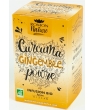 L Infusion plaisir Curcuma Gingembre Poivre Bio Romon Nature est une infusion Bio efficace pour renforcer vos defenses immunitaires. Cette decoction naturelle se compose de trois differentes plantes bio dont les bienfaits ne sont plus a prouver : le curcuma, le gingembre et le poivre. Le curcuma est une plante d origine indienne, reconnue pour ses proprietes anti-inflammatoires, antiseptiques, cicatrisantes et antivirales ; il contribue a proteger le systeme digestif. Le gingembre, qui possede des vertus antioxydantes et antibacteriennes, aide aussi a la digestion et soulage le sentiment de nausees. Quant au poivre, cette epice complete la composition de la tisane. Elle permet au curcuma et au gingembre de multiplier leurs actions benefiques pour le corps. La synergie des trois principes actifs presents dans cette infusion bio permet donc de procurer un bien-etre optimal.